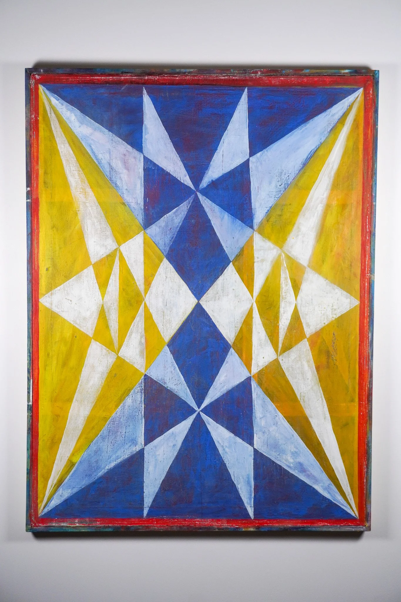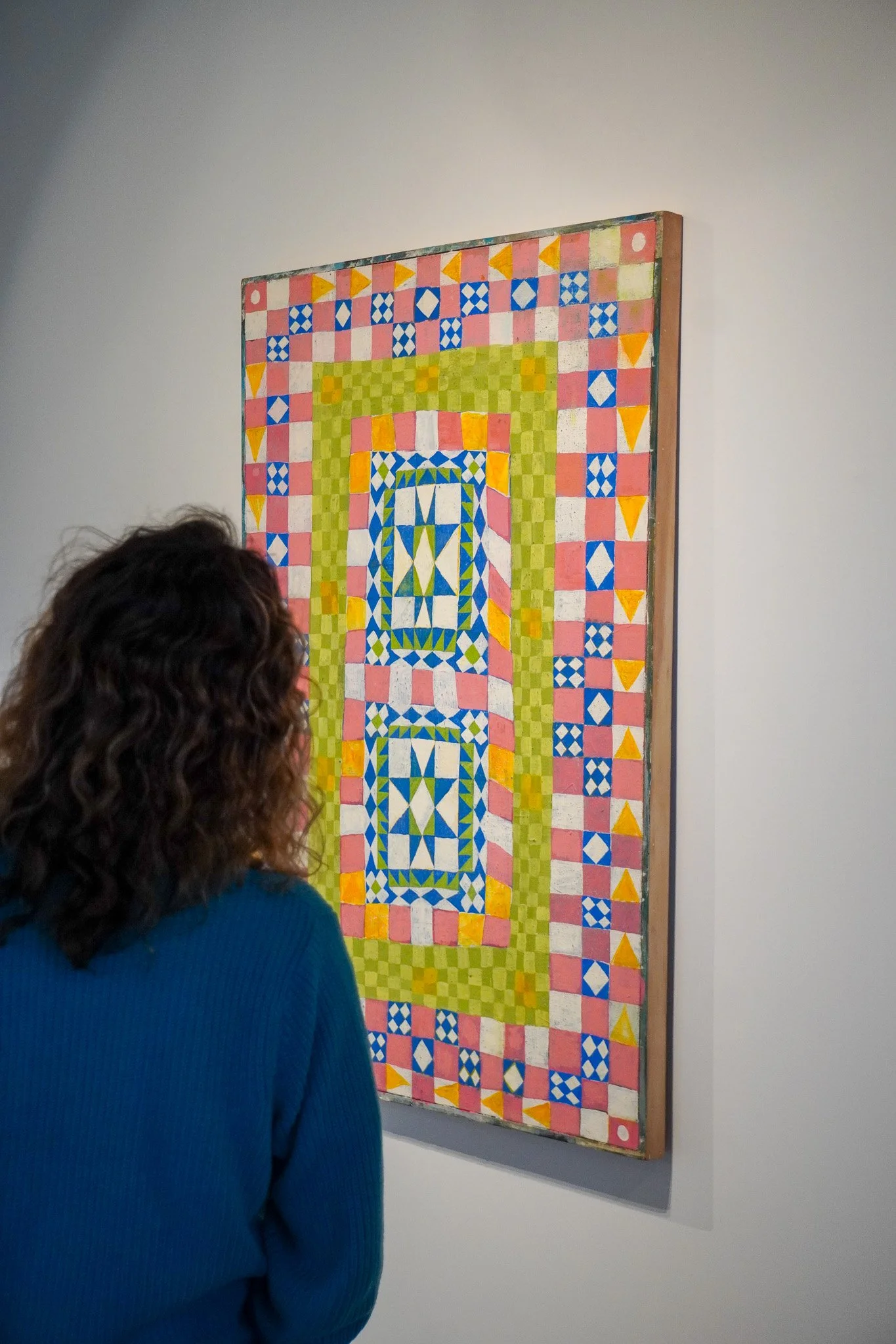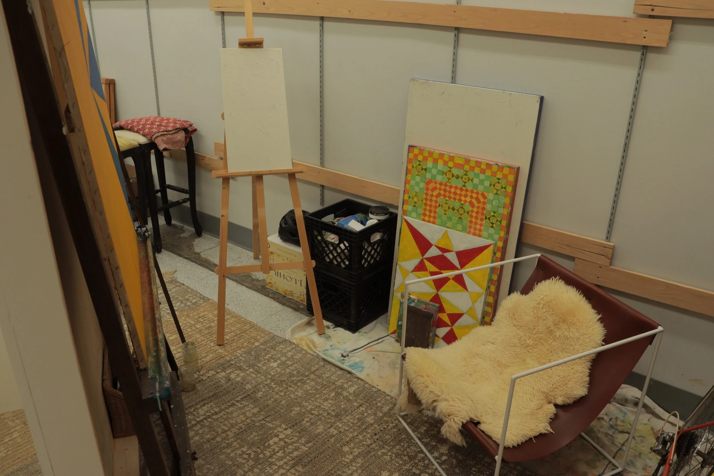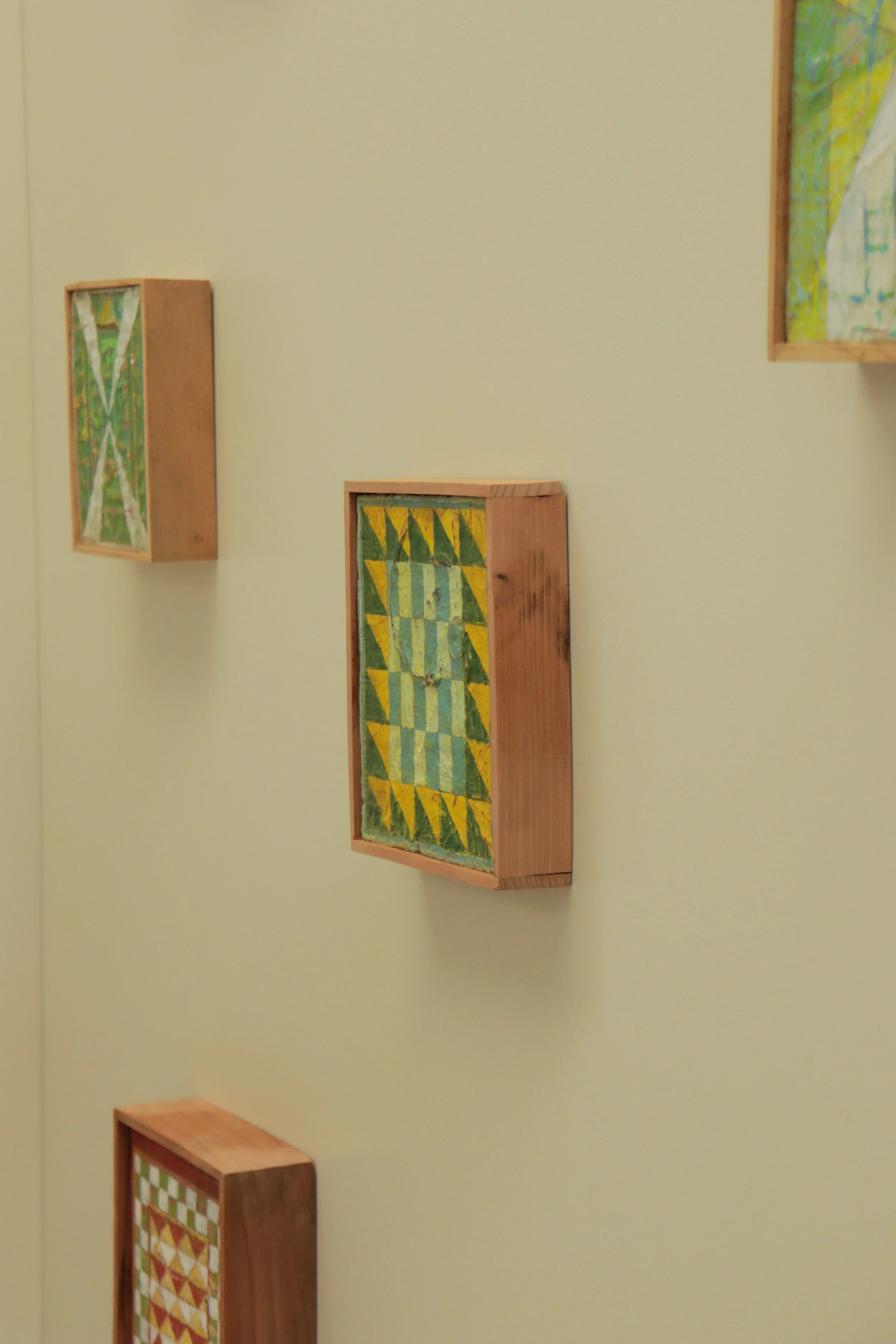 Interior of an art gallery with white walls, three colorful geometric abstract paintings, and a ceiling with exposed beams and track lighting.