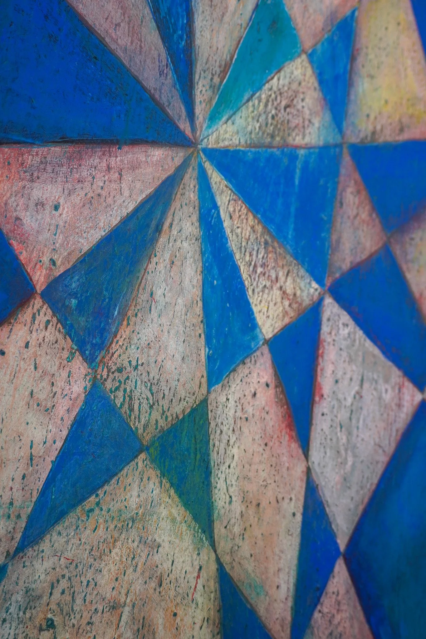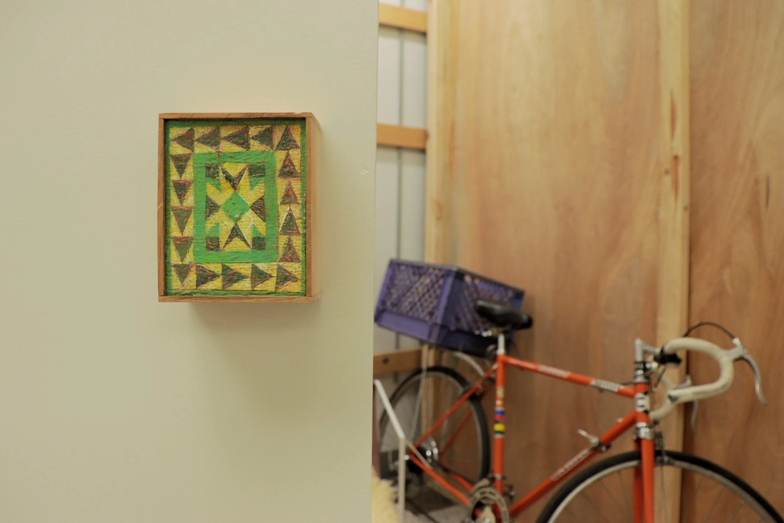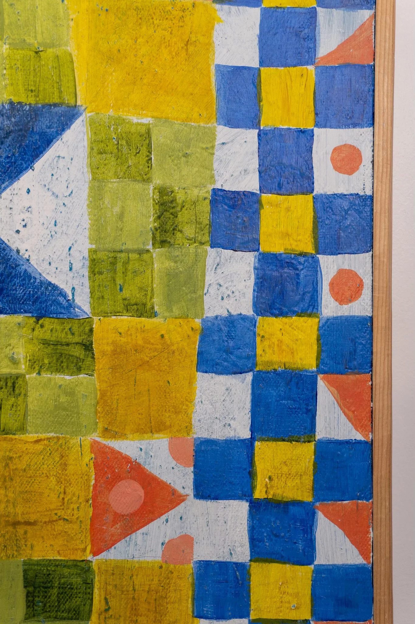 Interior of an art gallery with white walls, three colorful geometric abstract paintings, and a ceiling with exposed beams and track lighting.