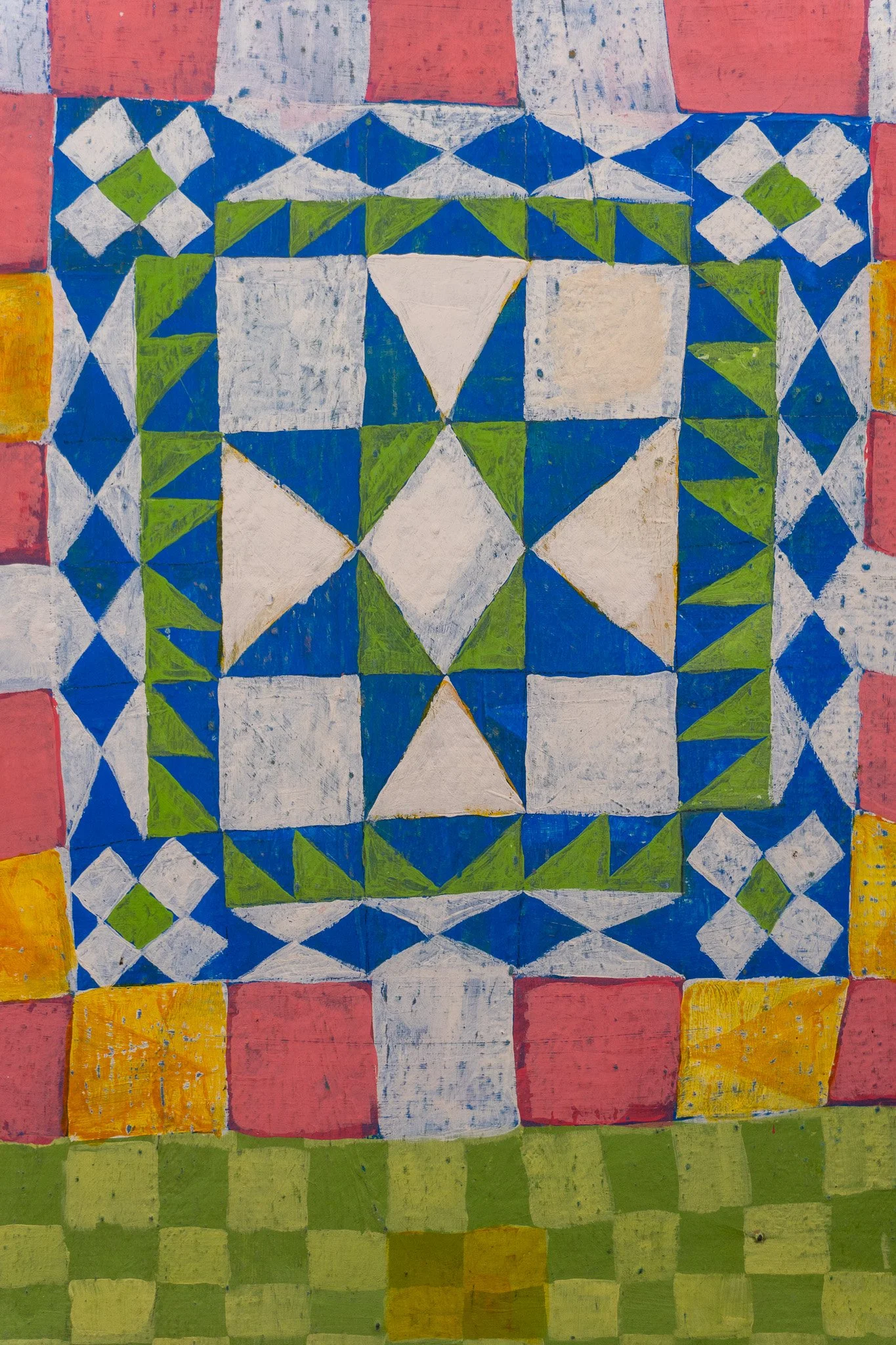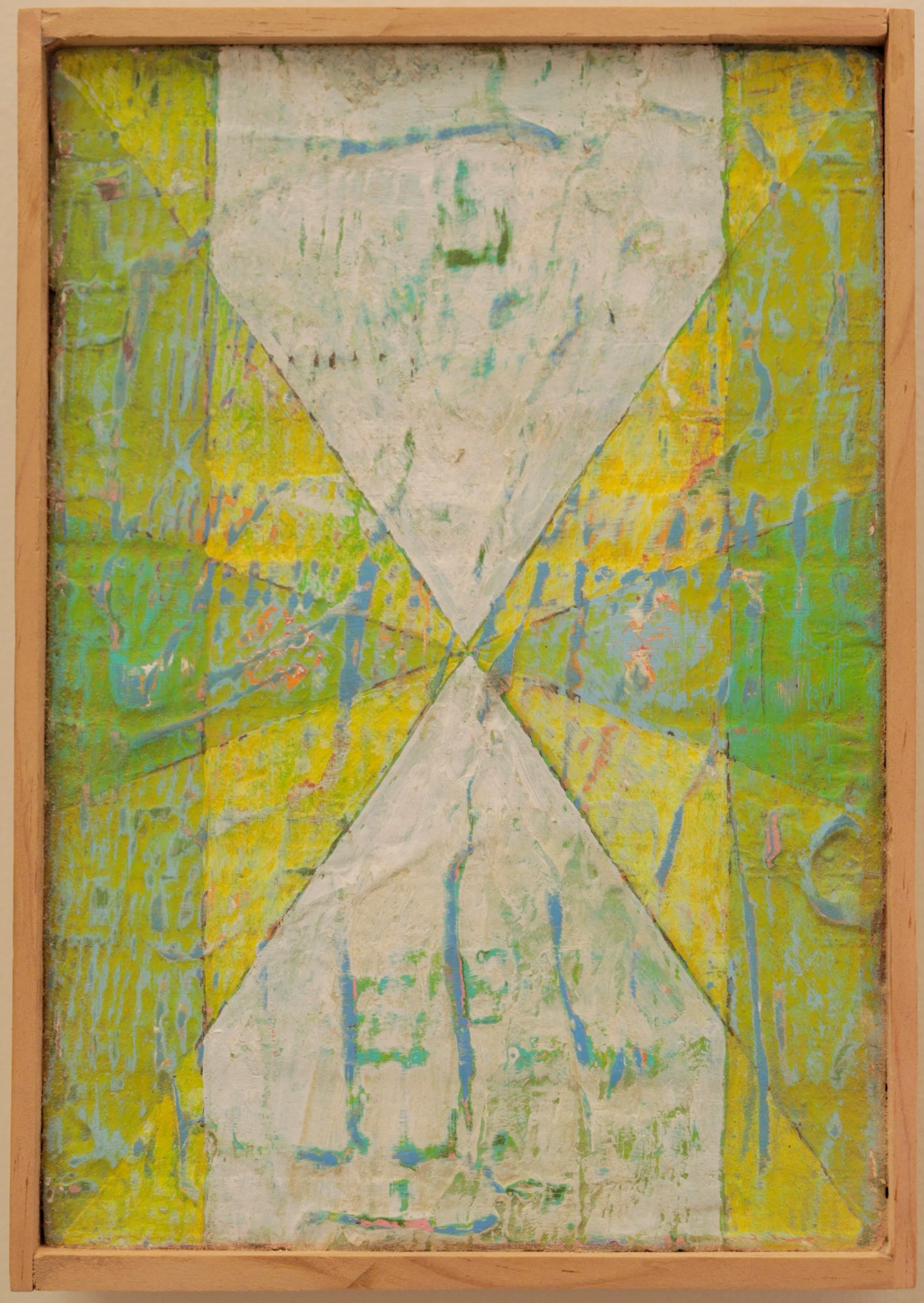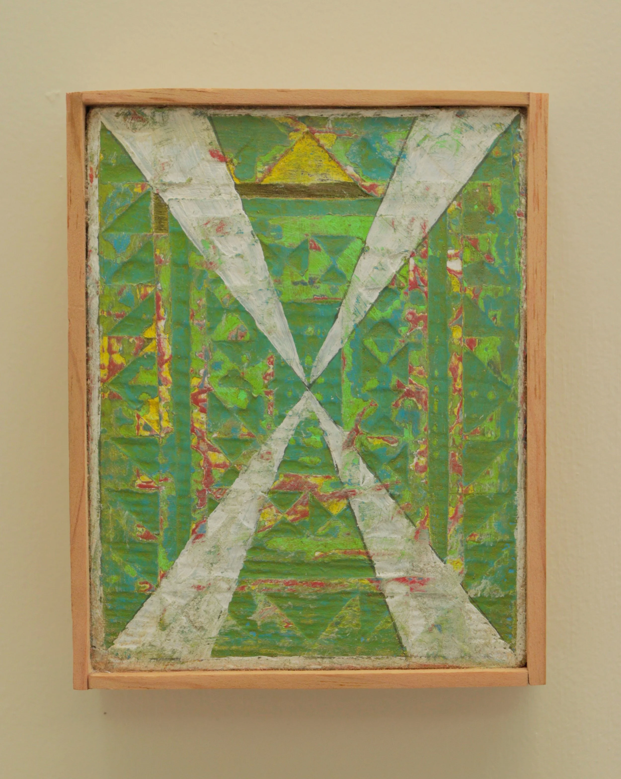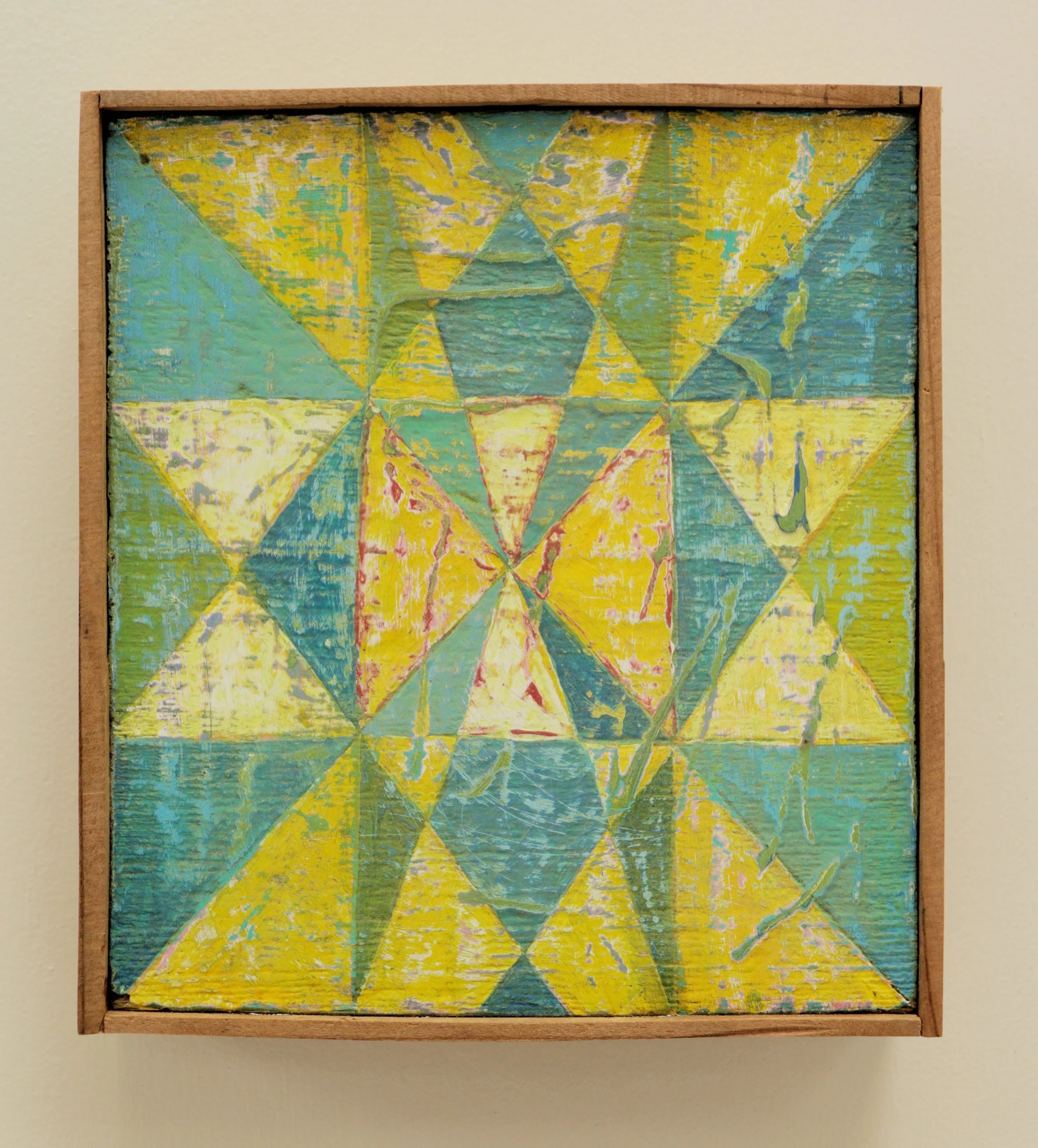 Interior of an art gallery with white walls, three colorful geometric abstract paintings, and a ceiling with exposed beams and track lighting.