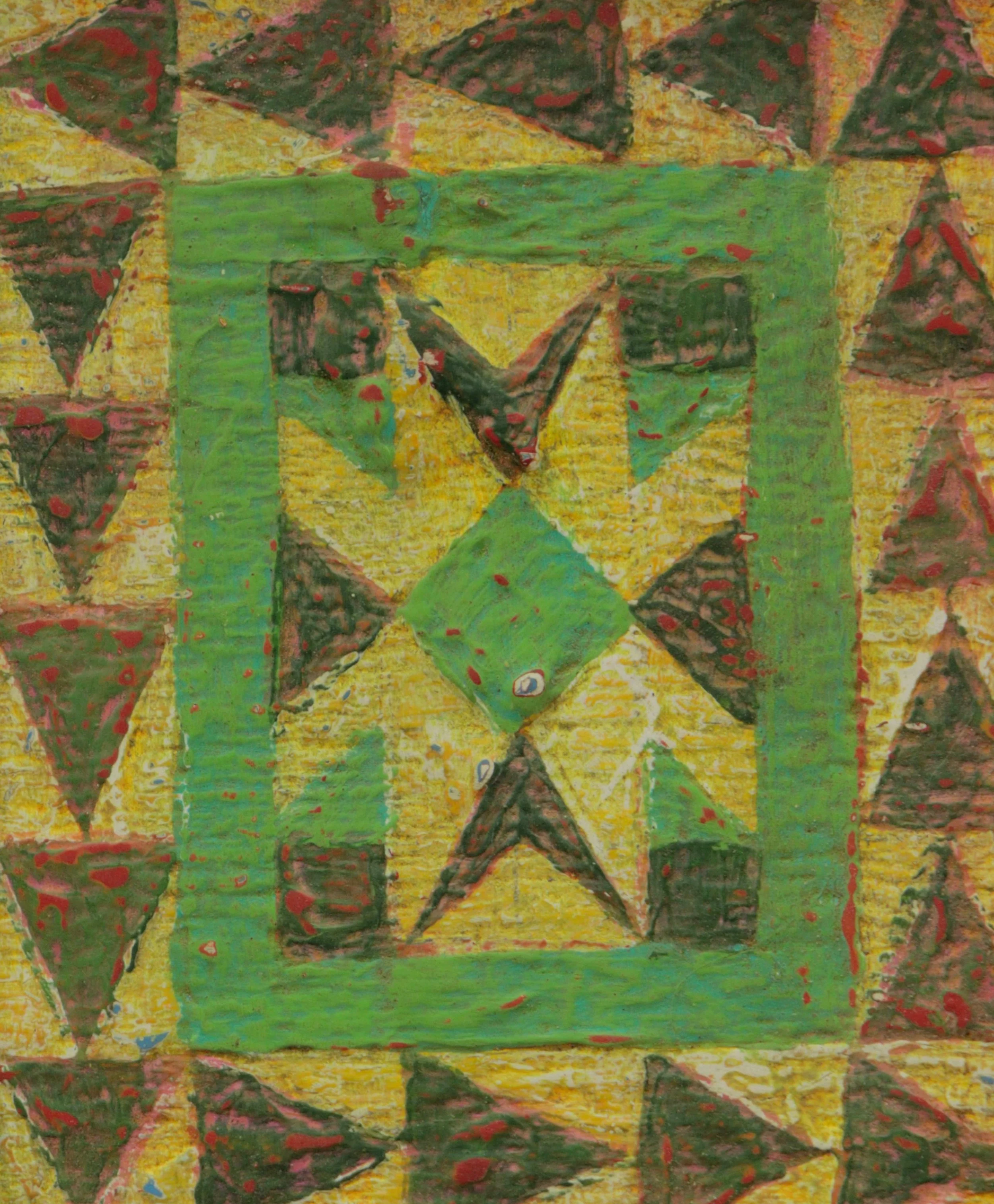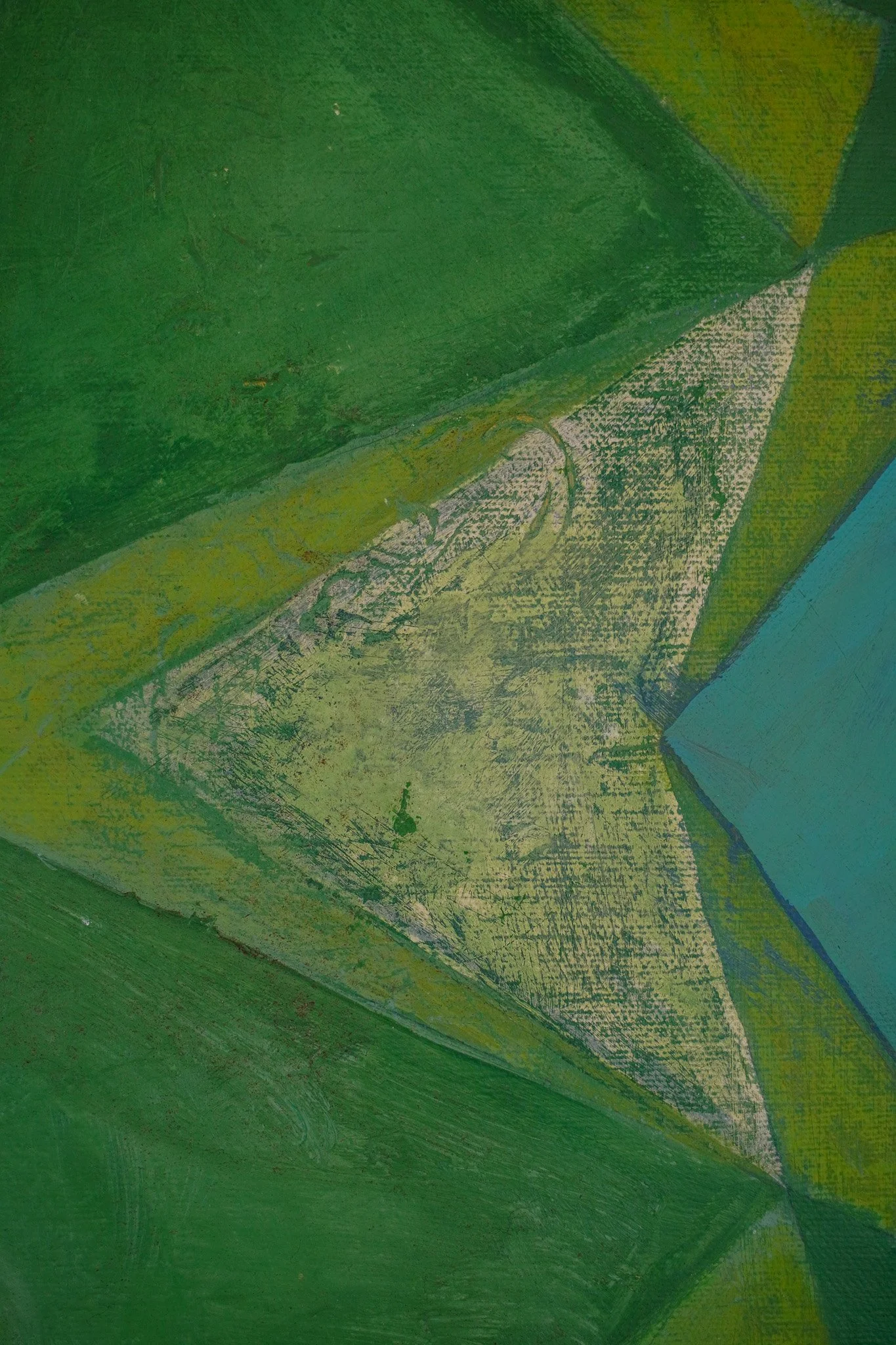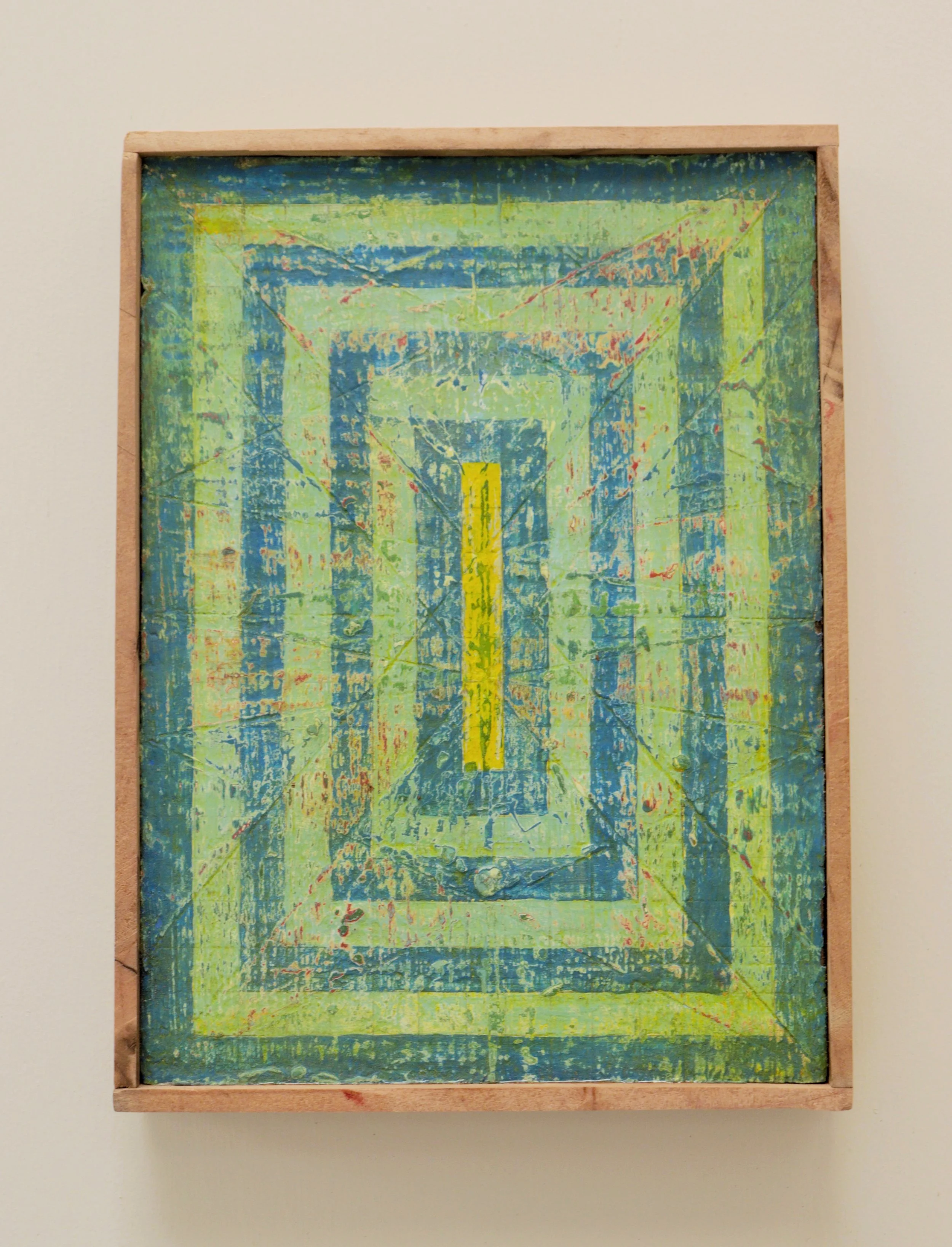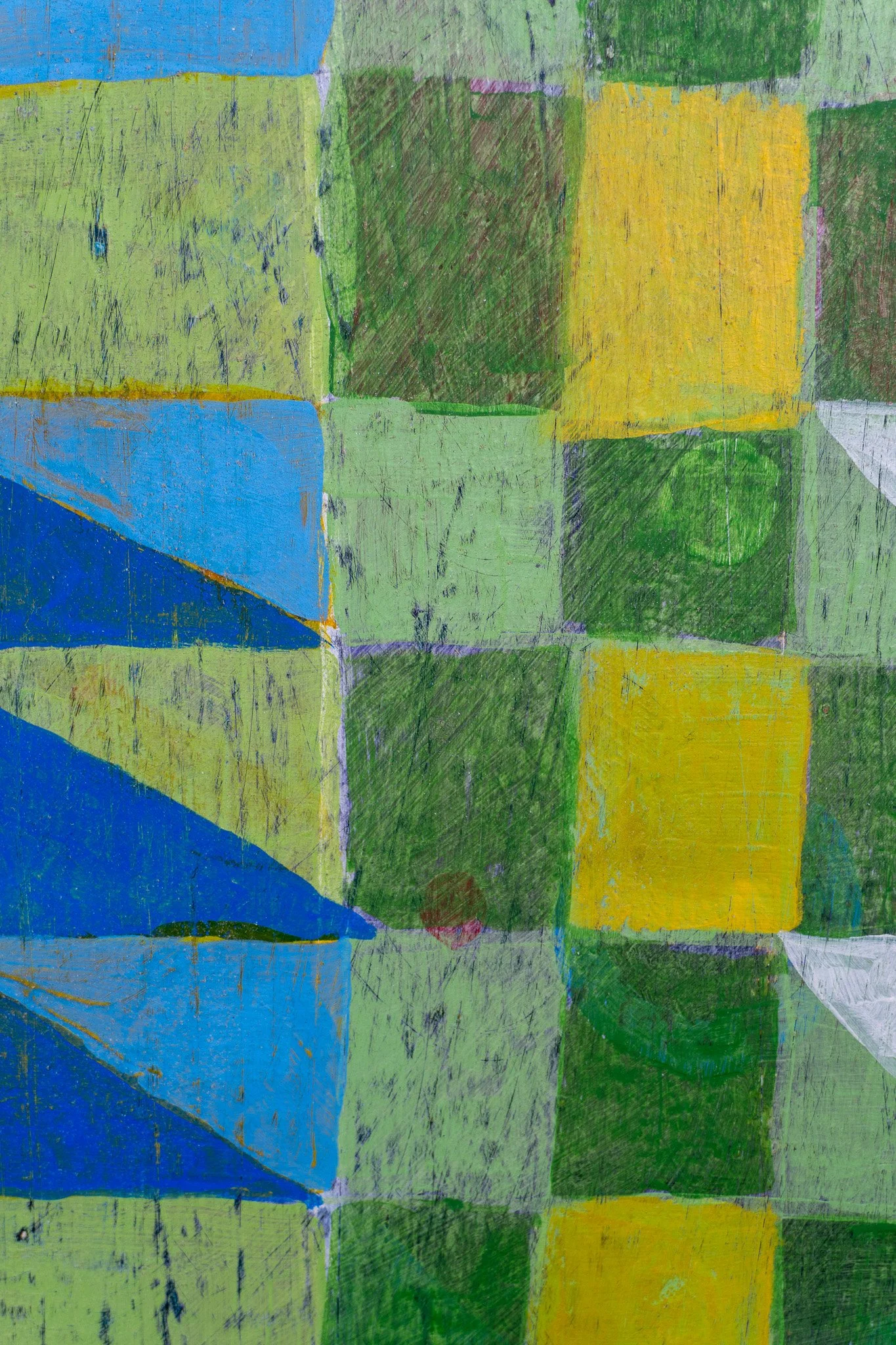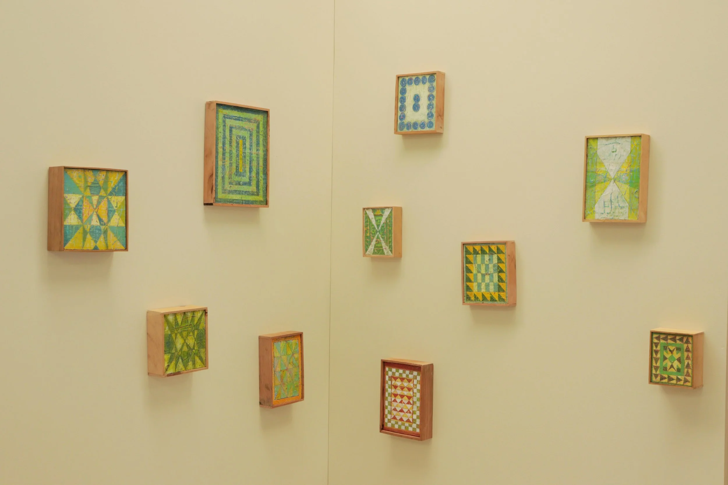 Gallery wall with ten framed abstracts, primarily in green and yellow, arranged in a staggered pattern on pale yellow walls.